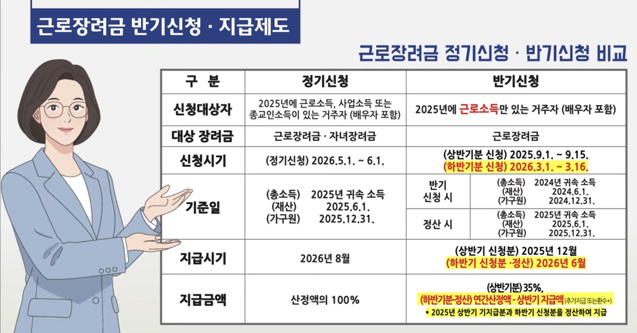 근로장려금은 원래 1년에 한 번(5월) 신청하지만, 소득 발생 시점과 장려금 지급 시점의 간극을 줄이기 위해 '반기 신청' 제도를 운영하고 있습니다.