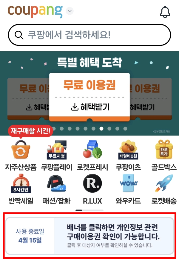 2. 홈 화면 상단 혹은 중간에 있는 '배너를 클릭하면 개인정보 관련 구매이용권 확인이 가능합니다' 문구를 찾으세요.