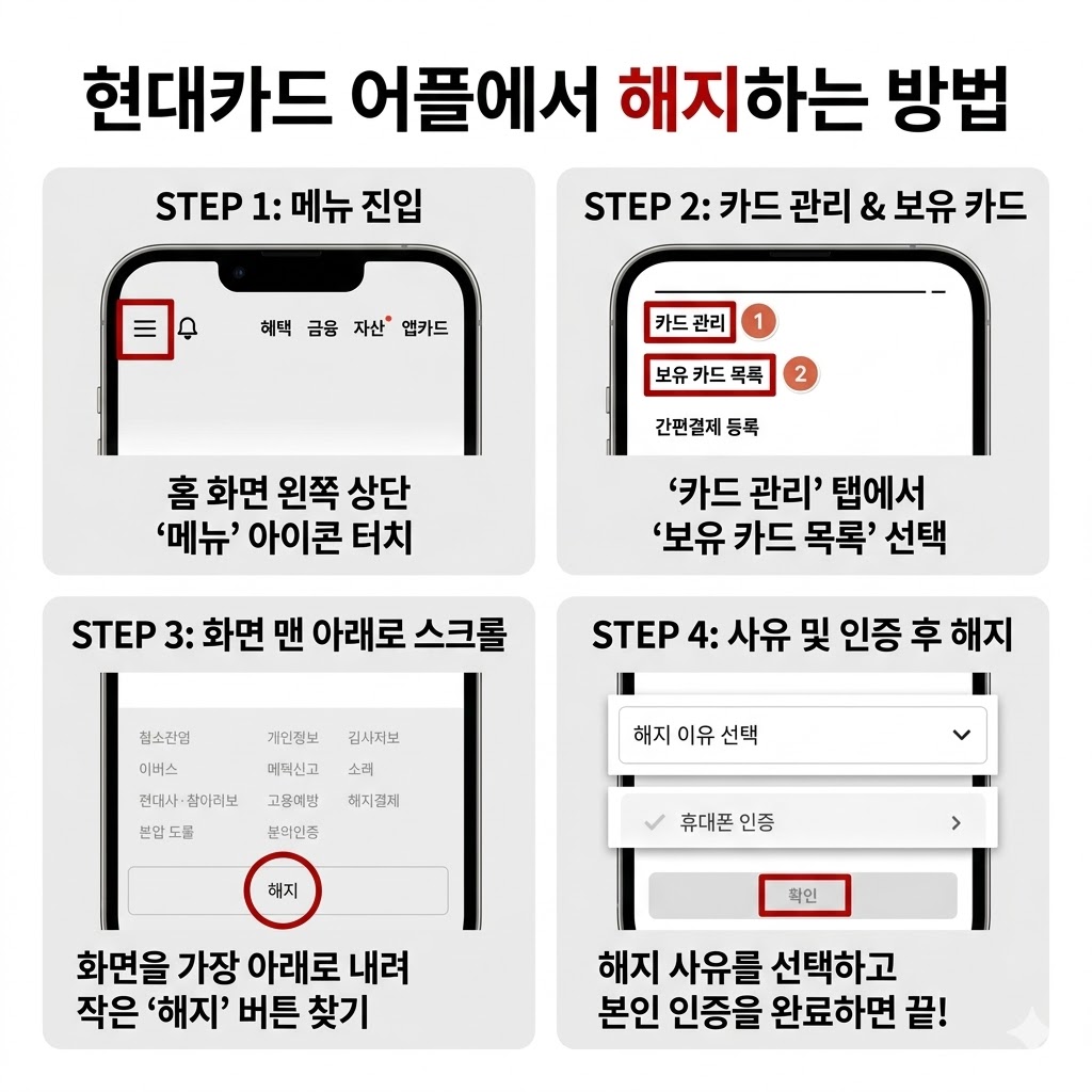현대카드 앱은 UI가 깔끔하지만, 해지 버튼은 의외로 꼭꼭 숨겨져 있어요. 아래 순서대로만 따라 하시면 1분 만에 완료됩니다.
