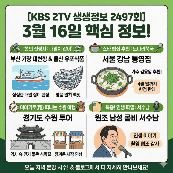 2026년 3월 16일 월요일, 저녁의 활력소 2TV 생생정보 2497회에서 소개된 따끈따끈한 방송 정보를 정리해 드릴게요.