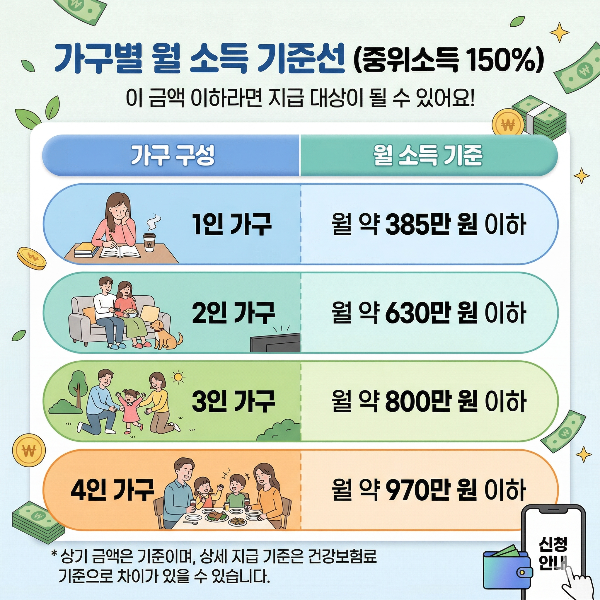 | 선정 기준 (중위소득 150%) | 월 소득 약 385만 원 이하 | 월 소득 약 630만 원 이하 | 월 소득 약 800만 원 이하 | 월 소득 약 970만 원 이하 |